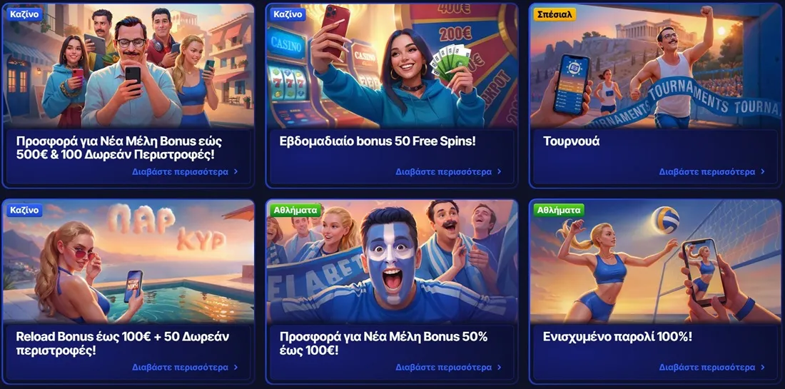 - Προσφορά καλωσορίσματος. Ολοκληρώστε την εγγραφή και κάντε κατάθεση τουλάχιστον 10 ευρώ. Με αυτόν τον τρόπο, μπορείτε να ξεκλειδώσετε ένα μπόνους αντιστοίχισης 100% έως 500 ευρώ, μαζί με 100 δωρεάν περιστροφές στο φρουτάκι "Rise of Olympus".
